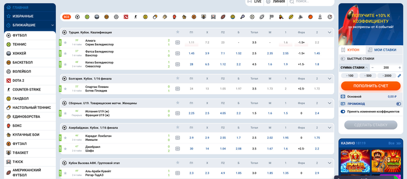 делать ставки на все актуальные спортивные события, в том числе в реальном времени (Live)